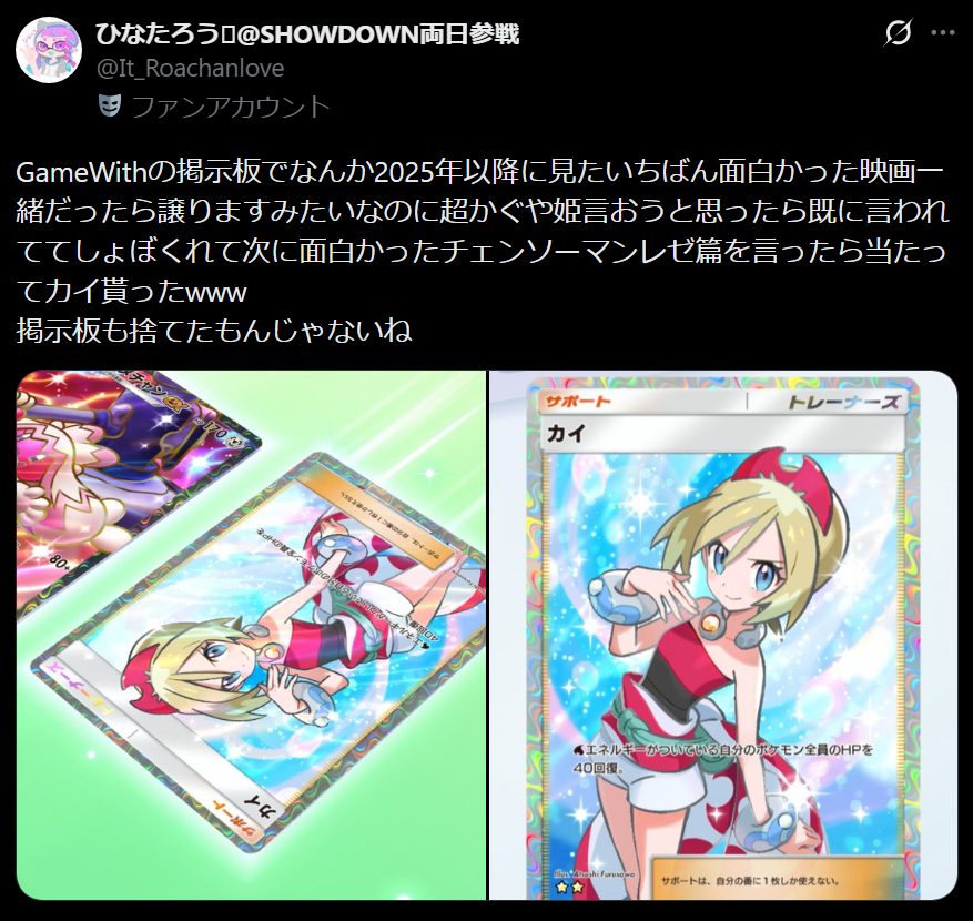 GameWithの掲示板でなんか2025年以降に見たいちばん面白かった映画一緒だったら譲りますみたいなのに超かぐや姫言おうと思ったら既に言われててしょぼくれて次に面白かったチェンソーマンレゼ篇を言ったら当たってカイ貰ったwww 掲示板も捨てたもんじゃないね